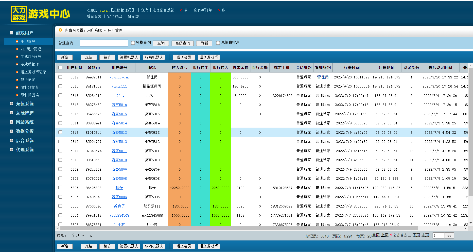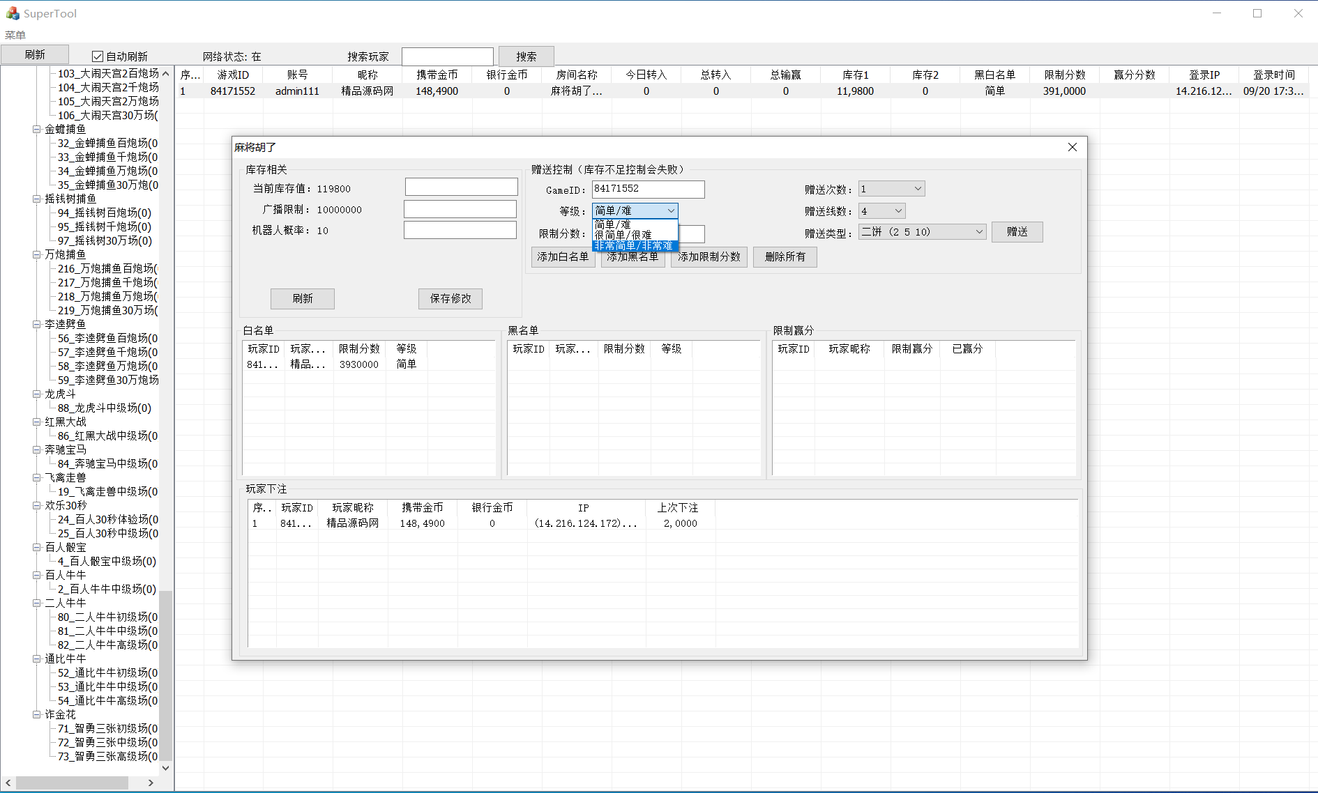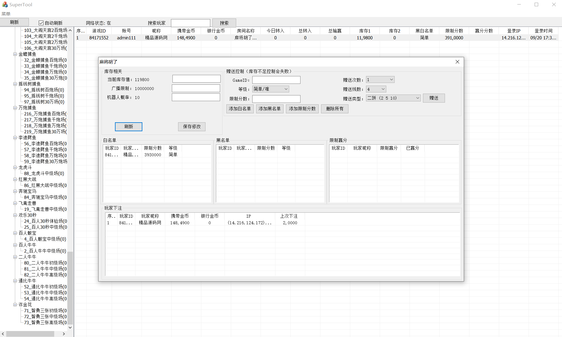 彩鲸捕鱼为独立超端控制,控制端功能简单方便,功能强大,方便大家运营。特色:超端控制,控制开奖,输赢多少,难度控制,库存控制。全子游戏可用可控,棋牌,百人,捕鱼游戏都有机器人陪玩。