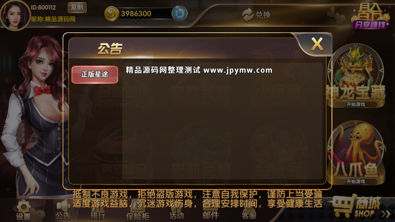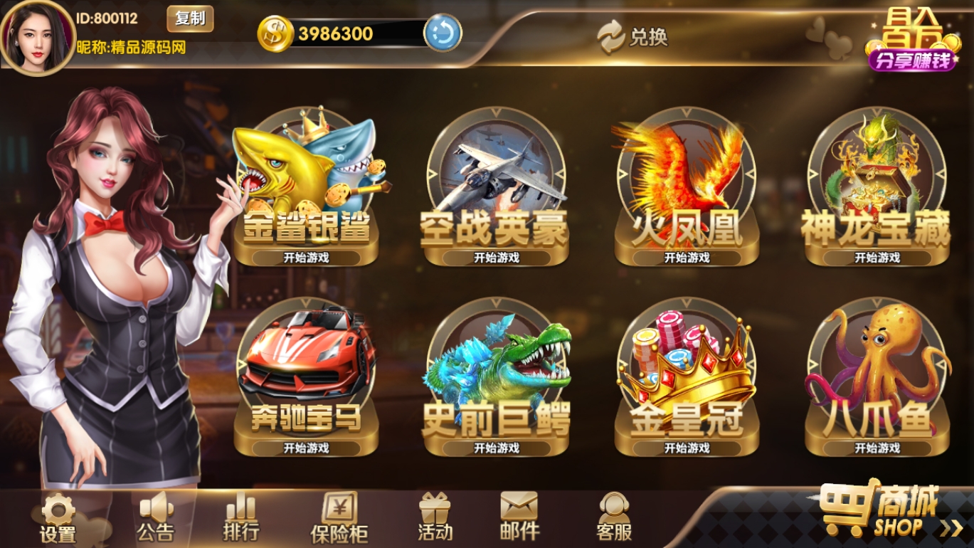 包含游戏:摇钱树,金蟾捕鱼,李逵劈鱼,单挑,牛魔王,美人鱼,渔乐无穷,幸运六狮,单挑(ATT连环炮)金鲨银鲨,空战英豪,火凤凰,神龙宝藏,奔驰宝马,史前巨鳄,金皇冠,八爪鱼。
