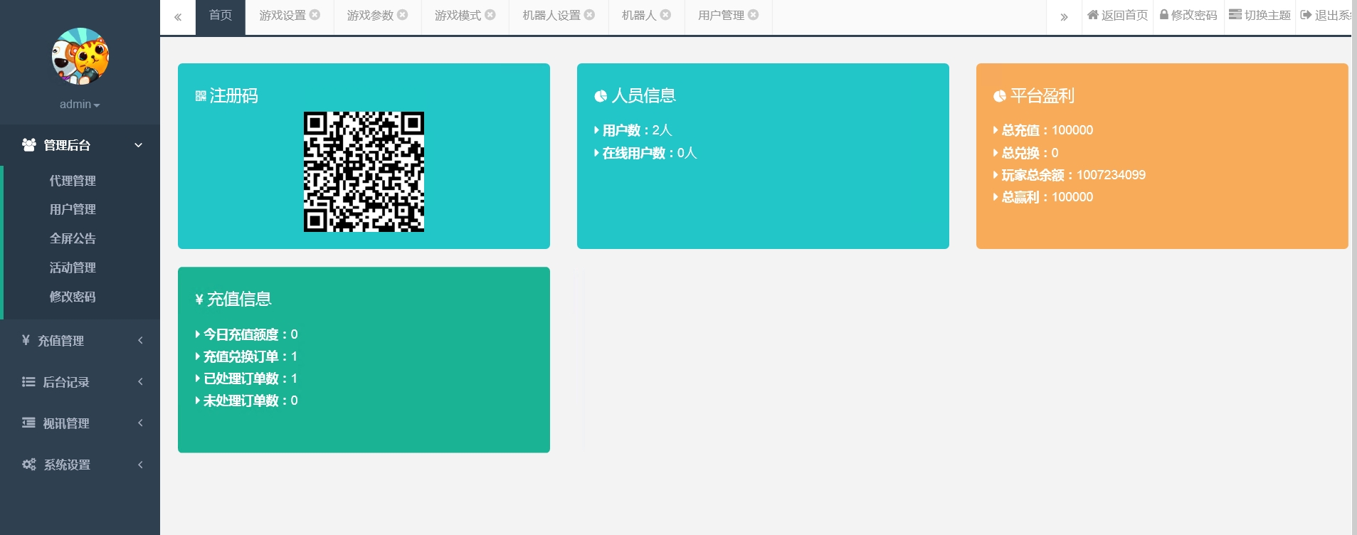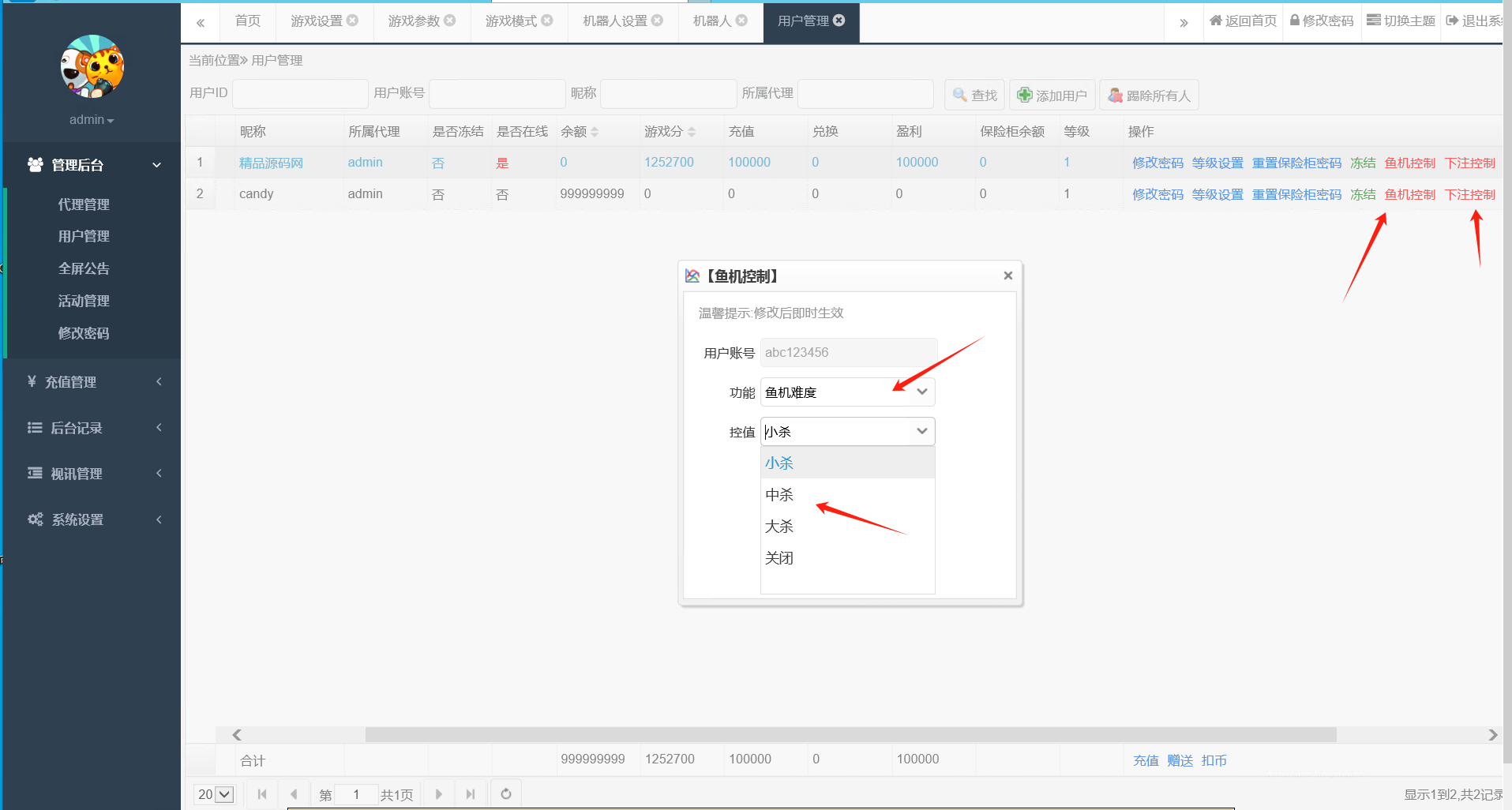 这平台的控制很牛逼,后台有全局库存控制,设置好后可以实现无人值守自动运营,吃分和吐分,吞吐自然起伏,像小波浪一样,让玩家欲罢不能。。。并有精准点控,针对平台的特殊玩家。