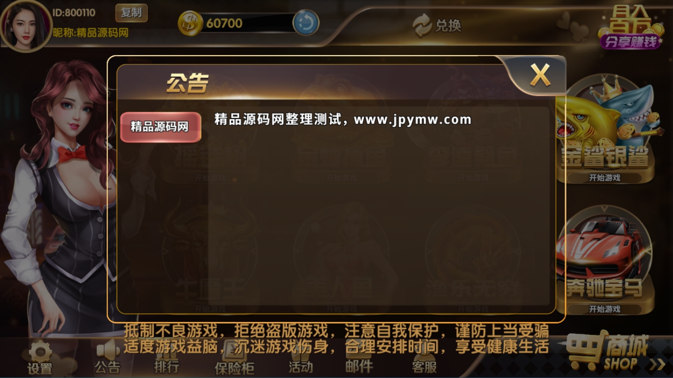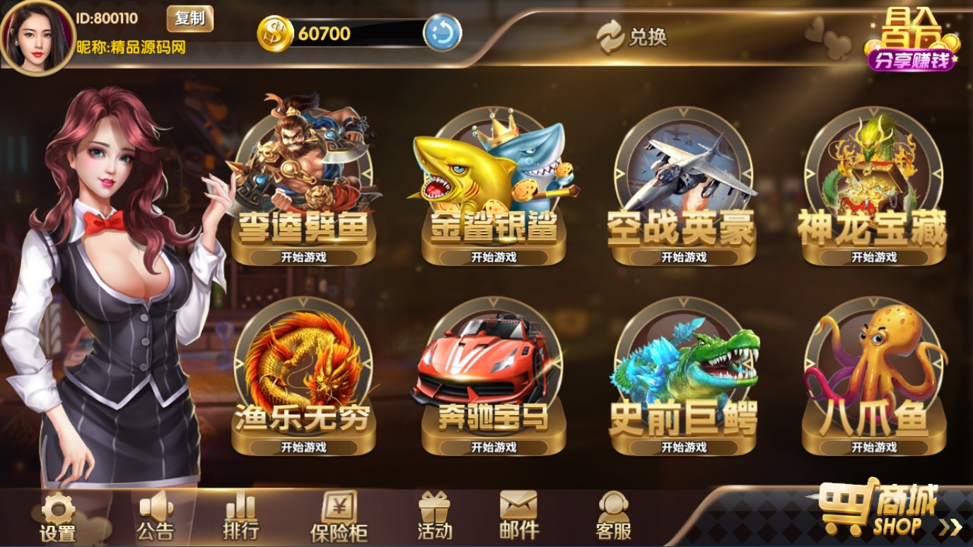 游戏列表: 摇钱树,金蟾捕鱼,李逵劈鱼,金鲨银鲨 空战英豪 神龙宝藏 牛魔王,美人鱼,渔乐无穷,奔驰宝马,史前巨鳄,八爪鱼。