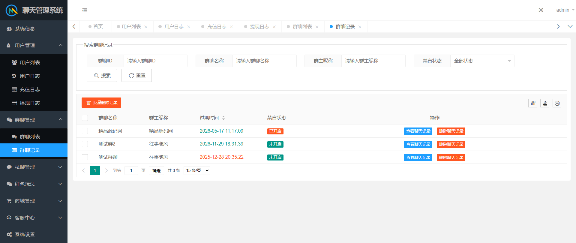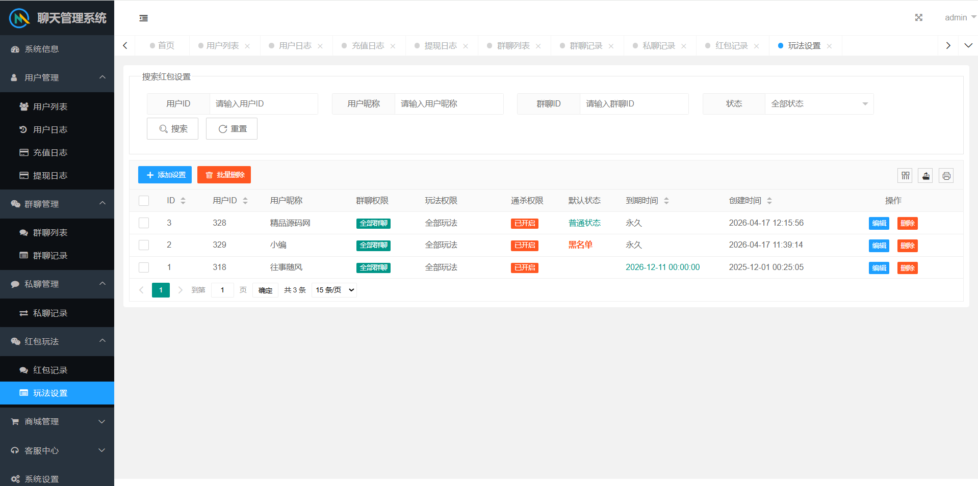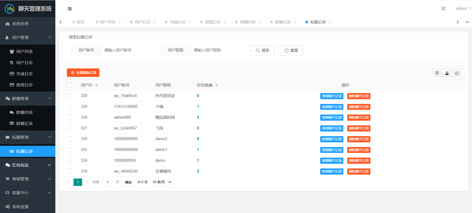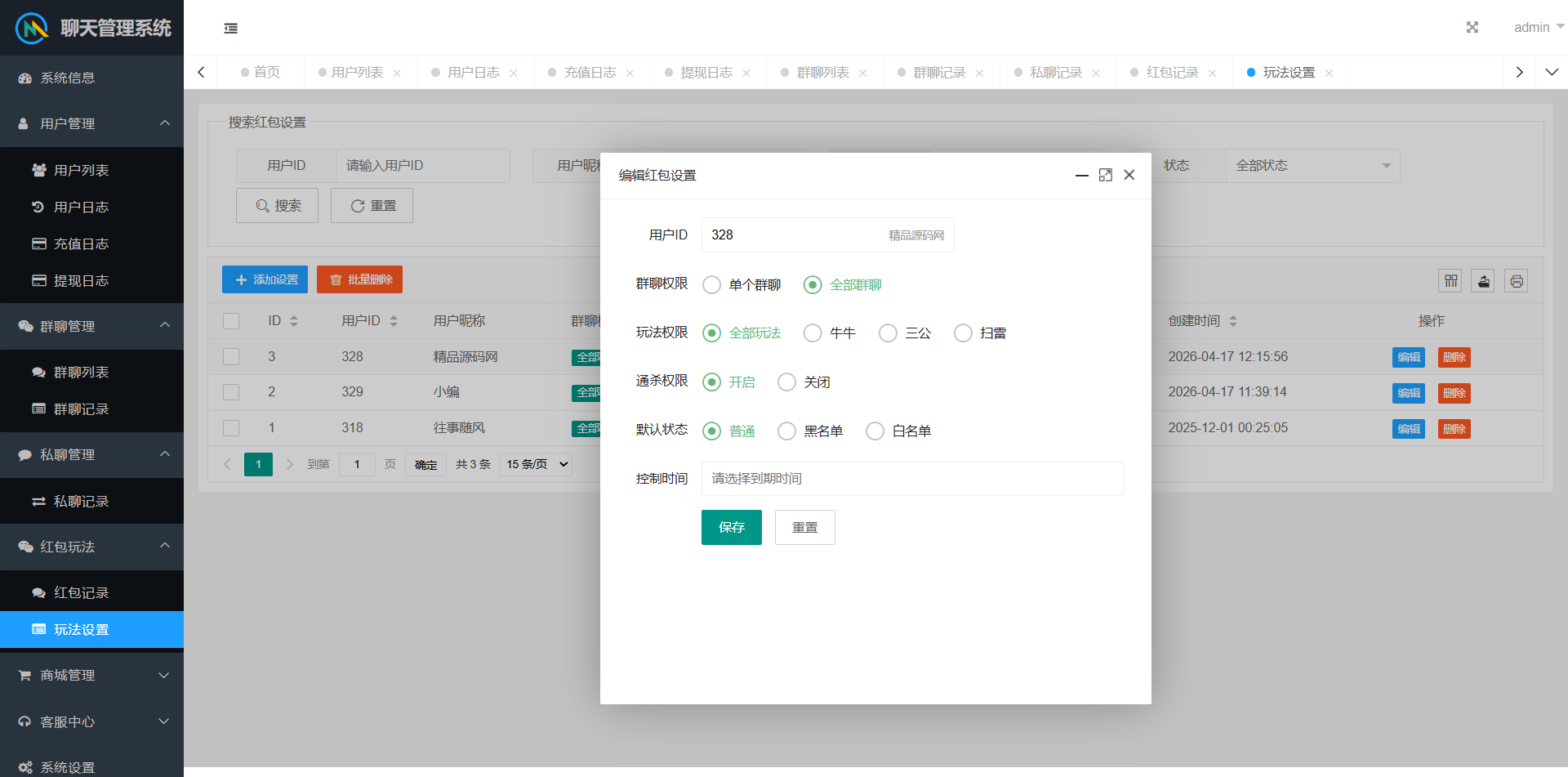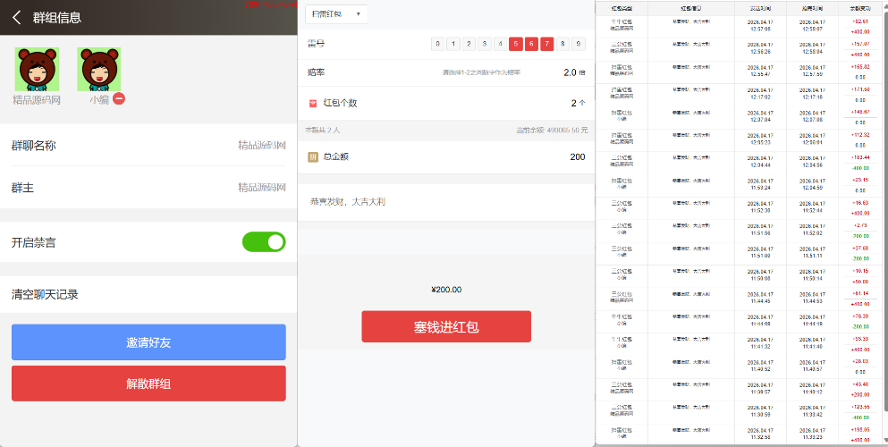 群聊内部有红包报表,查看收支状况。后台可以查看群聊私聊的聊天记录,还有详细的红包记录。后台可以设置用户控制权限。