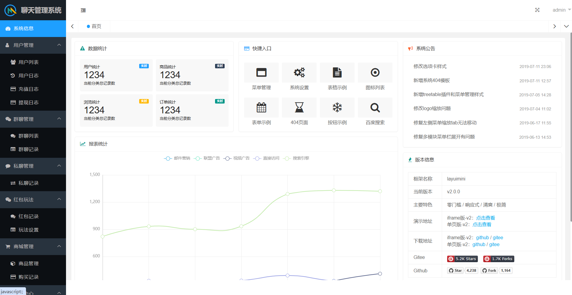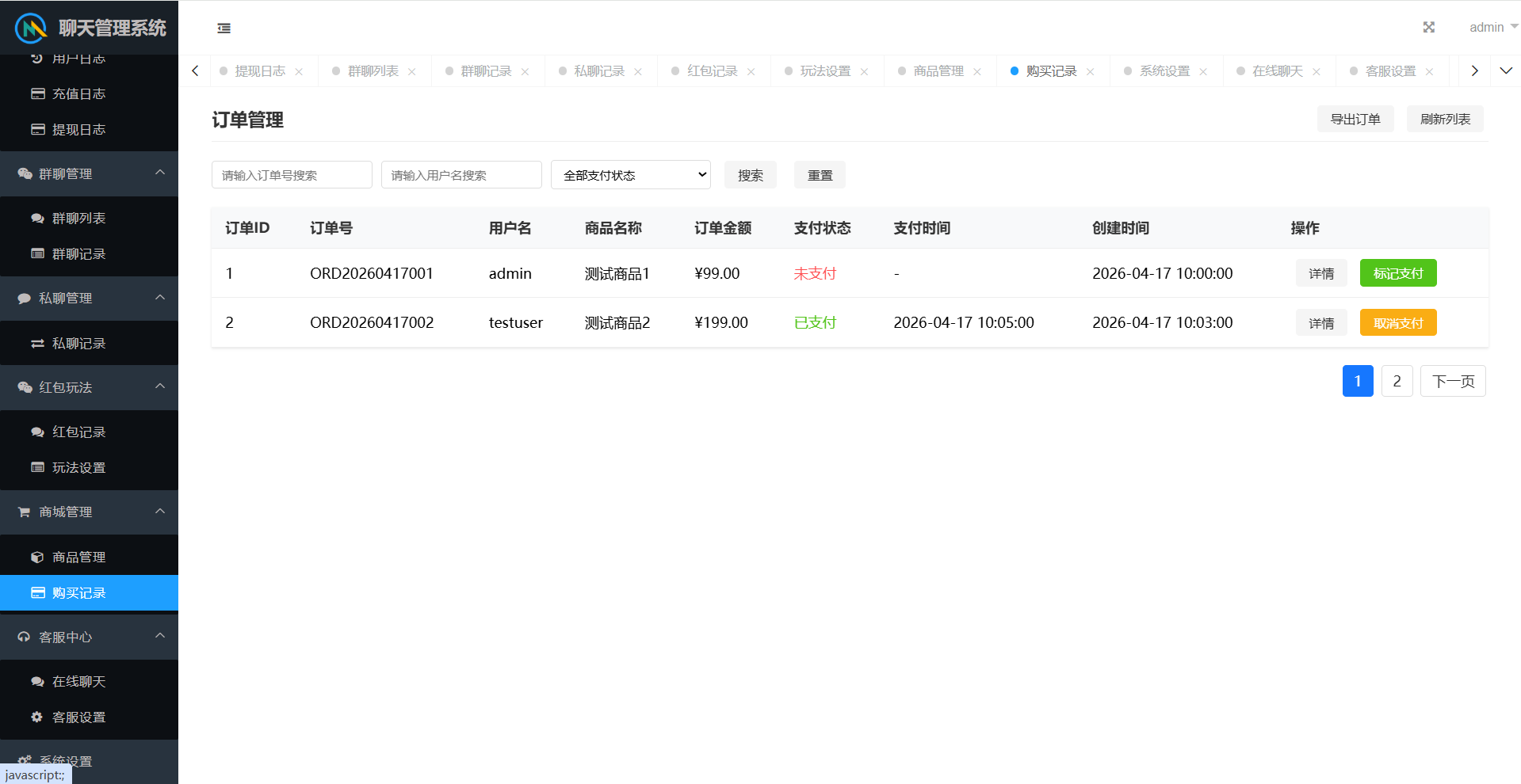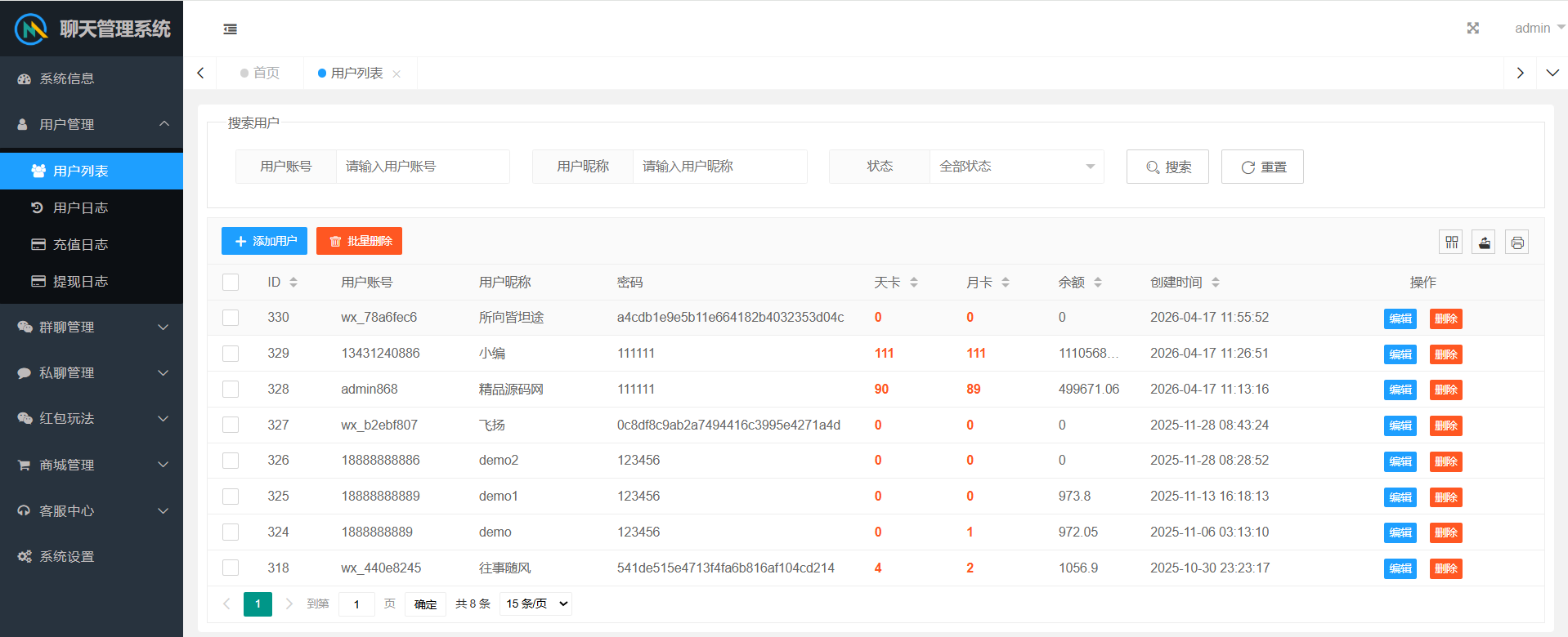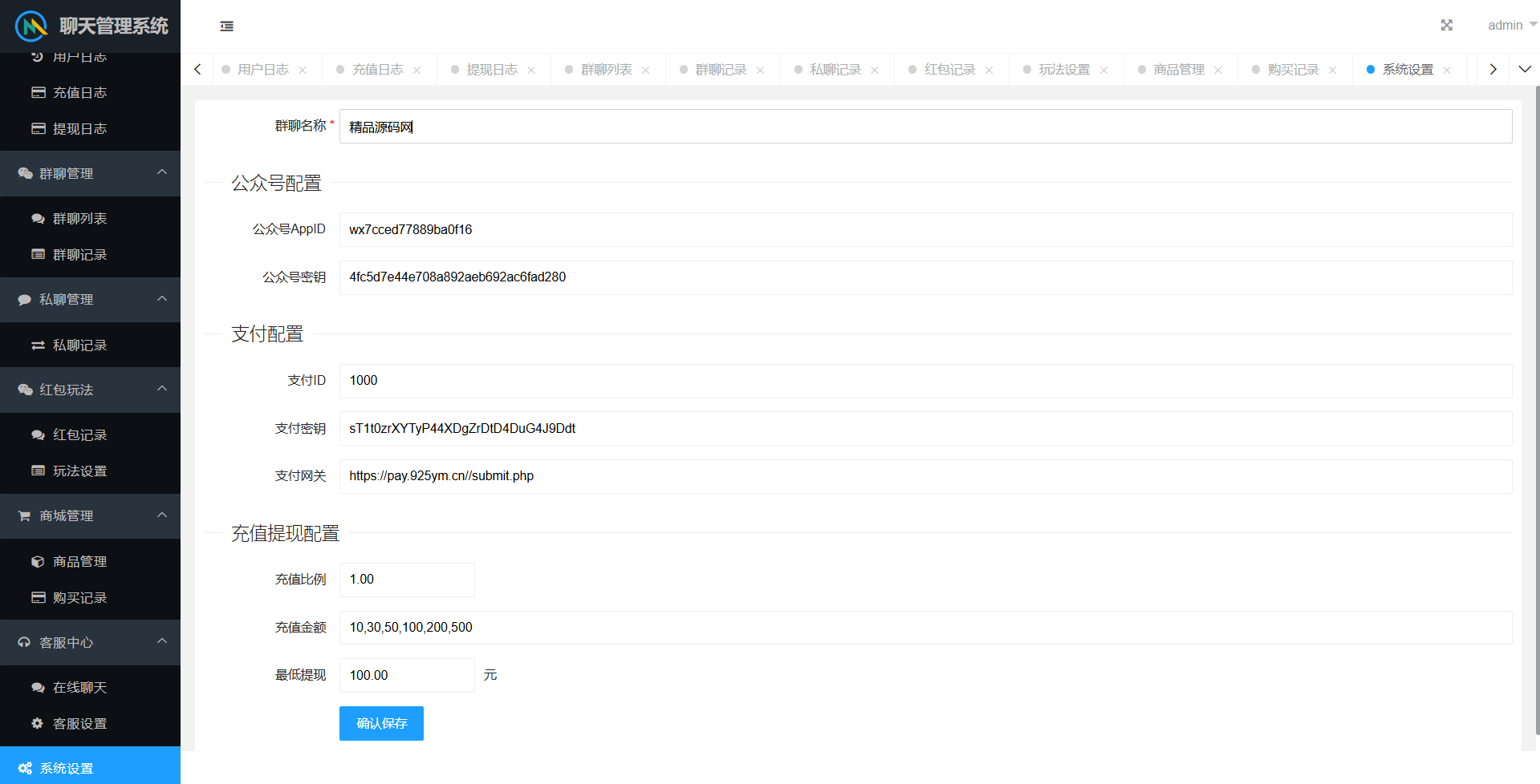 群聊内部有红包报表,查看收支状况。后台可以查看群聊私聊的聊天记录,还有详细的红包记录。后台可以设置用户控制权限。