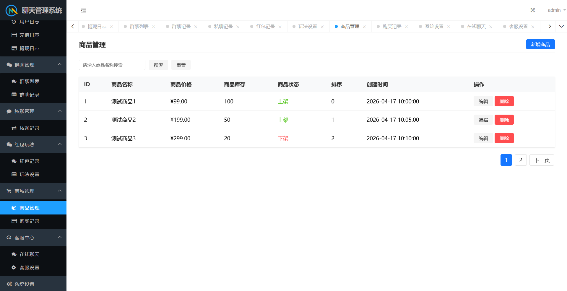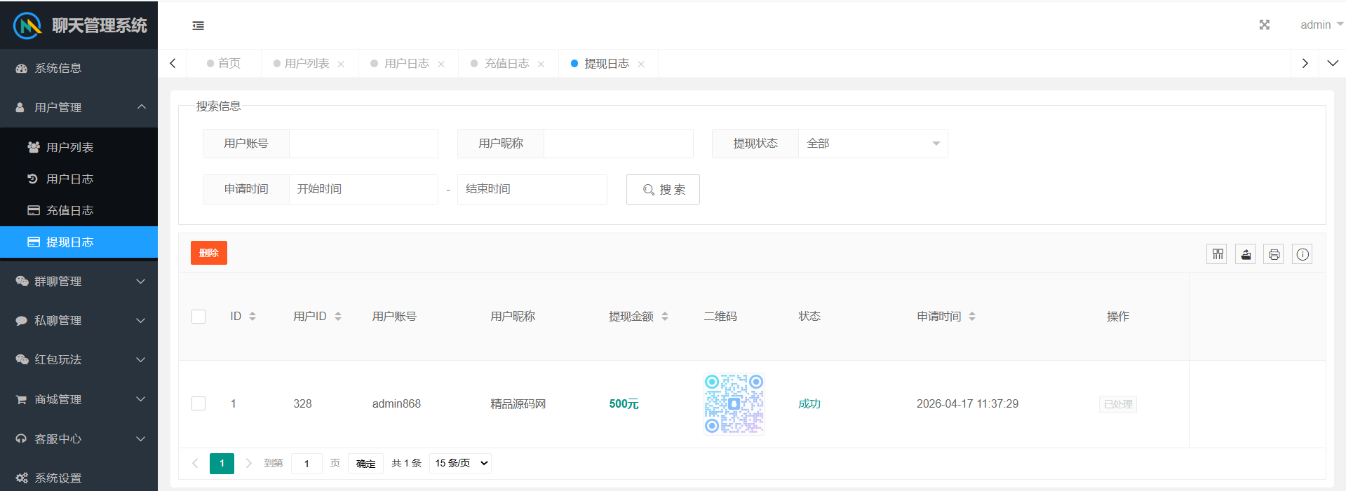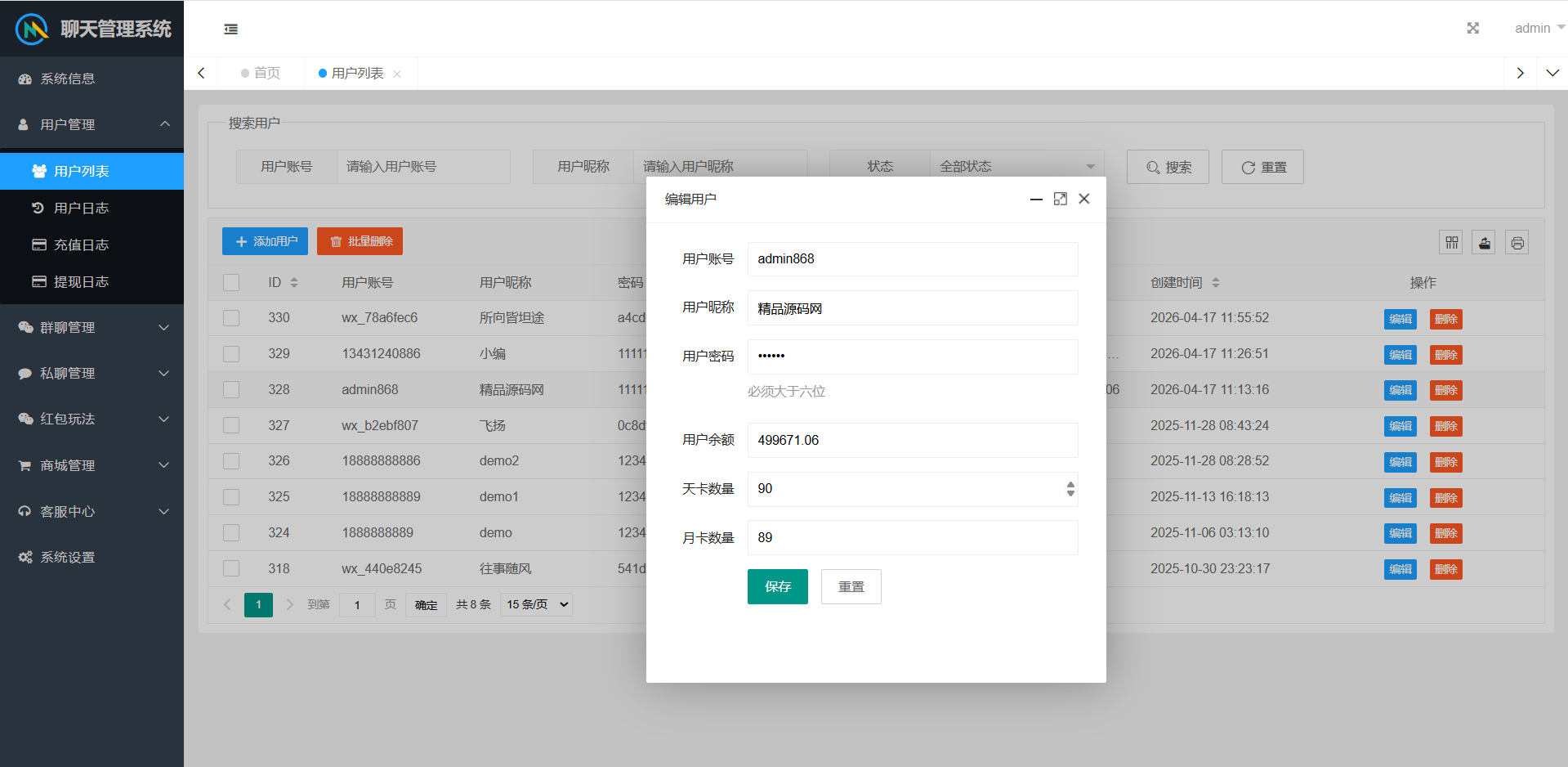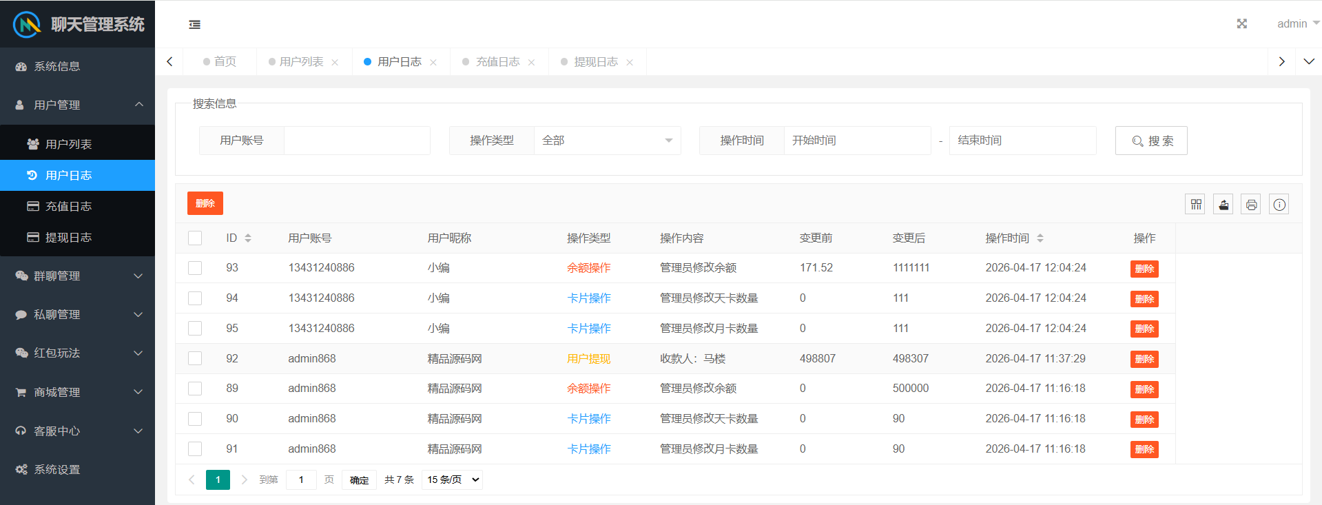 群聊内部有红包报表,查看收支状况。后台可以查看群聊私聊的聊天记录,还有详细的红包记录。后台可以设置用户控制权限。