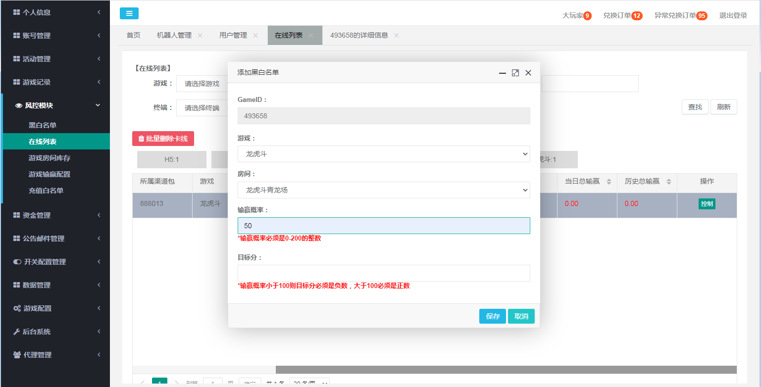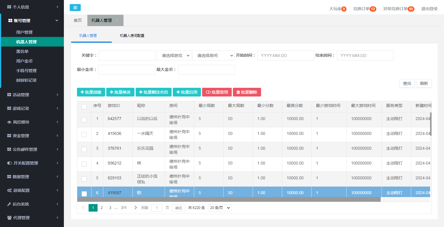 可以批量添加机器人进入指定房间和设置机器人陪玩局数和时长,能够设置机器人 相互模拟 主动陪玩 被动陪玩 等,可以设置游戏名字 可以自由开关增删游戏房间等