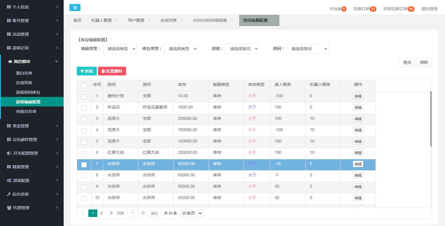 游戏超多功能强大:后台带库存控制和精准控制,前端功能按钮可以随意设置是否显示,进入房间可以设置最低多少分进入 房间底分可以自由设置